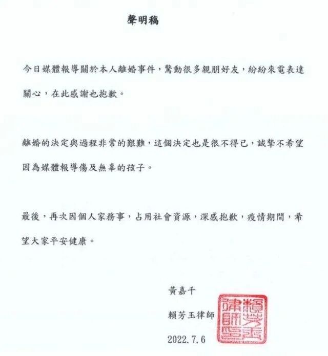 随后,黄嘉千通过律师向媒体发布离婚声明,表示:离婚这件事没想到会惊动这么多人,而离婚的决定与过程非常地艰难,这个决定也是很不得已,诚挚不希望因为媒体报道伤及无辜的孩子,看来两人之间的离婚是有什么事发生,具体什么就不知道了。