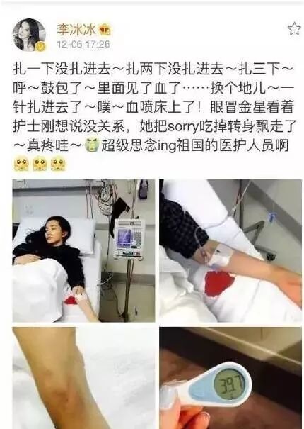 12月6日下午,李冰冰在她的官方微博上晒出生病照片,分享了扎针时的惨痛经历。面容憔悴的她,高烧39.7度,左手插着输液管,白色的床单上还有一滩扎针留下的血迹,手上密密麻麻全是针眼,惨不忍睹,让网友直呼心疼。
