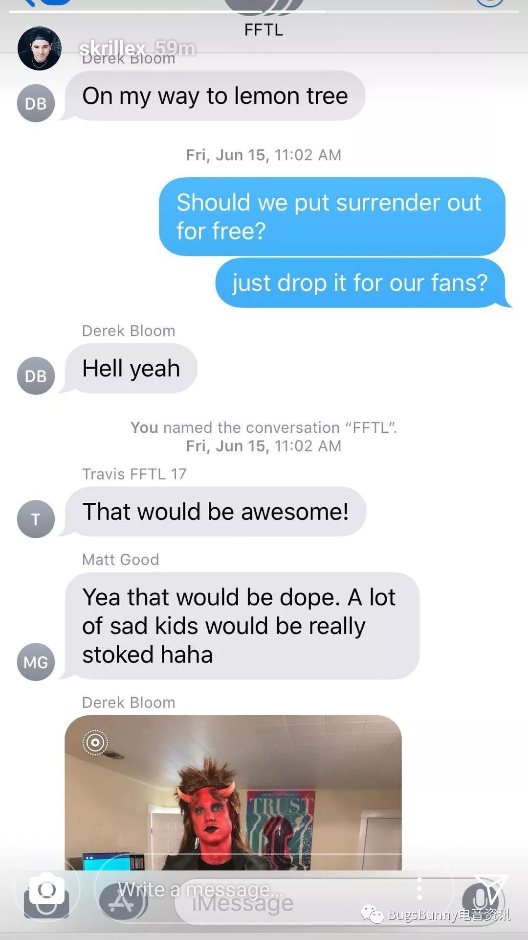 手机截屏指出了一首名为“Surrender”的新歌,他们想要把这首歌免费送给粉丝。Matt Good是FFTL的歌手和吉他手。