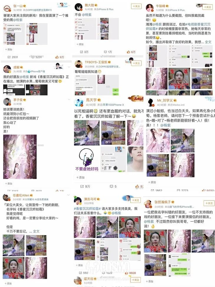 到了《亲爱的,热爱的》时她虽然没有再拼命宣传,但帮忙宣发的艺人阵容同样很强悍,因为在经历《香蜜》后“帮杨紫宣传”仿佛已经成为一个下意识行为了。