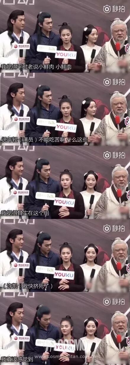 前不久,许凯上了热搜,不是因为做了什么大事,而是剧组接受采访,一众主演排开,画面最右边的老戏骨跟记者掏心掏肺的讲,“我觉得老说小鲜肉不能吃苦,我觉得其实在这个组...”,话还没完许凯低头对女演员说了句,“我快挤死了”。
