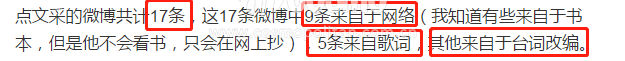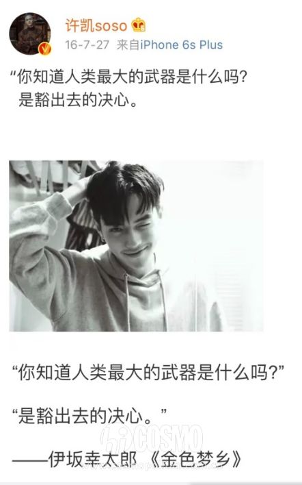 但地球没有停止转动,脚步又怎么可以停下?有粉丝总结了许凯的微博,发现他在300多篇微博里共有17条有文采的,而这17条里9条来自书籍,5条来自歌词,其余是电影台词改编。