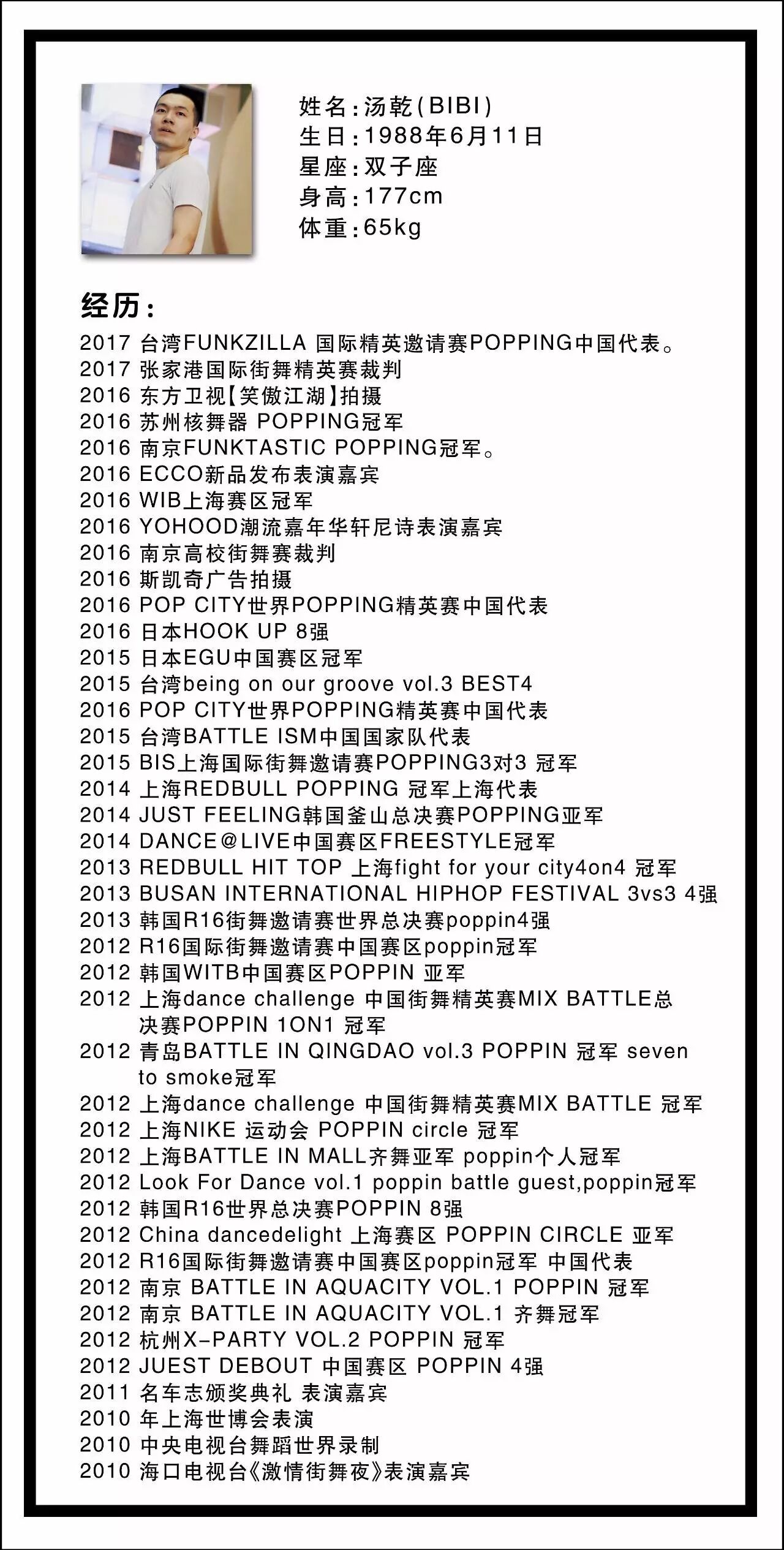 “从高中开始看了南贤俊的几段视频开始对POPPING着迷,觉得真的是太厉害了。高中毕业之后去了青岛上大学,一个偶然的机会,和舍友一起去向青岛著名dancer阿杜学习,这一学就一发不可收拾,从青岛的大学毕业之后来到上海加入了全国著名的 CASTER studio,有机会和Evo老师学习舞蹈,经过努力练习又有机会和美国的创始团队EB的每一位老师学习,到现在已经是第11个年头了。