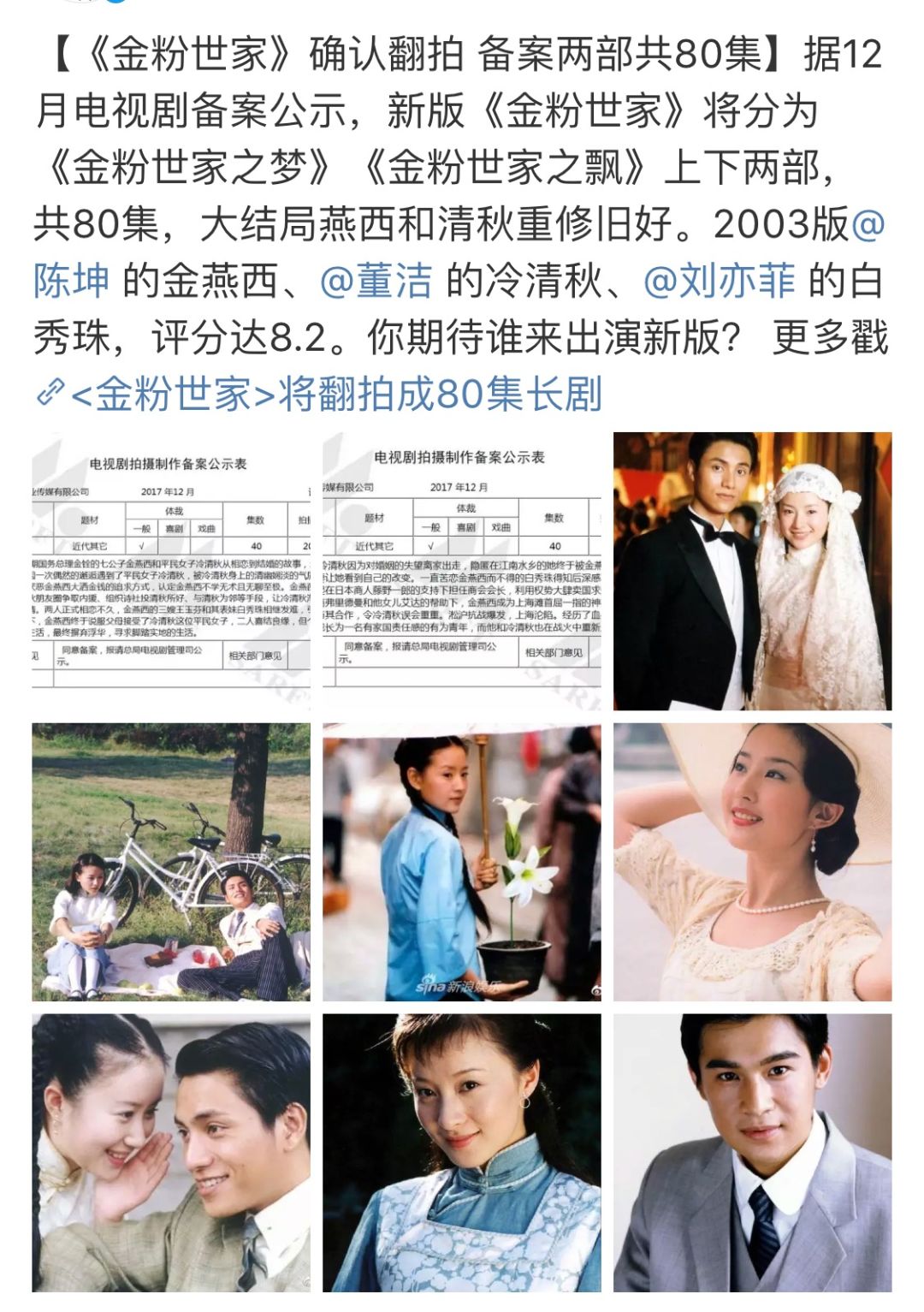 看备案公示表,这次《金粉世家》将翻拍为上下两部——《金粉世家之梦》和《金粉世家之飘》,共八十集