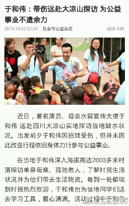于和伟如此一个有型有演技玩转时尚圈的魅力大叔,居然在公益活动上也能看到他的身影,身为“母亲水窖”的宣传大使, 于和伟不辞辛苦远赴四川大凉山实地探访当地缺水状况,活动过程中于和伟带领探访队员们进行高海拔“无水挑战”、为缺水家庭背水,并在微博上实时分享感悟,号召大家节约用水,为山区的同胞们伸出援助之手这更让于大叔化身为一枚公益暖男啊!