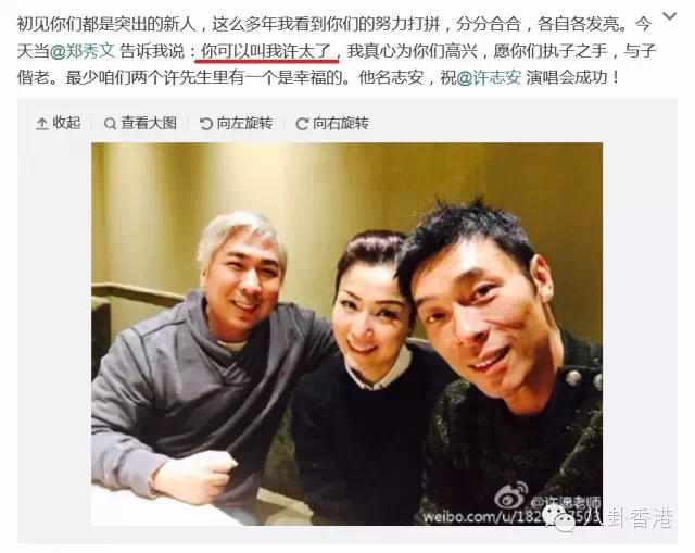 两人昨日与资深音乐人许愿食饭合照,而许愿将照片放上网分享,更写道:“初见你们都是突出的新人,这么多年我看到你们的努力打拼,分分合合,各自各发亮。今天当郑秀文告诉我说:你可以叫我许太了,我真心为你们高兴,愿你们执子之手,与子偕老。最少咱们两个许先生里有一个是幸福的。他名志安,祝许志安 演唱会成功!”