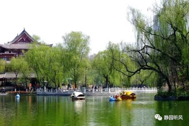 于是,便遇见一地新绿,满天风筝,欢快振翅的鸽群。兴庆湖碧波荡漾,几只小舟缓缓游动着,仿佛几尾鱼撩起水花嬉戏,划破了湖面上如镜般的平静,细细的涟漪扩散成一圈一圈的弧形,像好事的人,聚拢成里三层外三层,然后又渐渐走散,水面复归平静。岸边的迎春花刚刚吐蕊绽放,一片灿烂的鹅黄,吸引了不少游人的目光与镜头。空气中弥漫着泥土和青草的味道,间或有迎春花、桃花淡淡的清香味随风飘散。我顺手扯起一枝拂岸的垂柳,喜看其上布满了星星点点返青的绿苞,情不自禁吟诵道:“侵陵雪色还萱草,漏洩春光有柳条。”这是杜甫在腊日这一天的抒怀,今天的阳光大概与杜甫所经历的腊日同样明丽和暖吧。我凝神侧耳细听,春天的脚步,便顺着一株株鹅黄的小草和青绿的枝条,顺着一缕缕婉约的春风,循着一管清脆的笛音,姗姗而来,恍若风姿绰约的女子,轻盈地迈动袅娜的步态,举手投足都给人美的享受,足以唤起人们内心对美好和希望的遐想,那些冬藏心中的理想,便如破土的芽儿,抑或刚出壳的幼雏迫不及待放飞了翅膀。