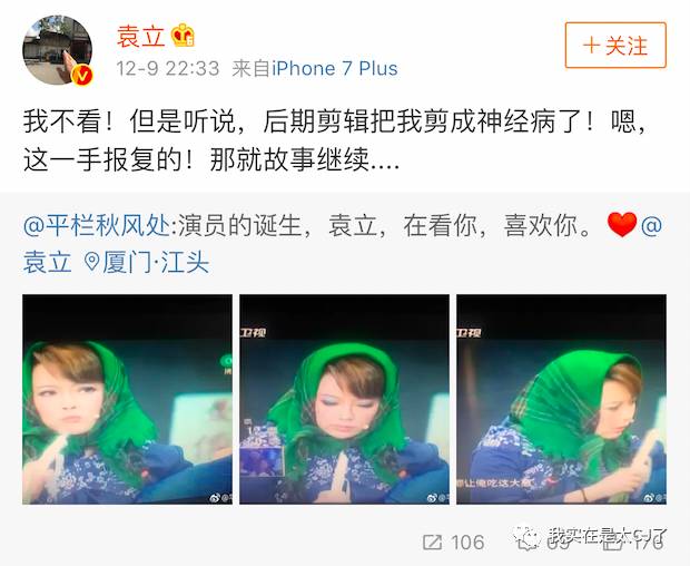 而袁立在当晚十点半左右转发了网友@自己的微博,说“听说后期把我剪成神经病了”,觉得这是报复,于是要继续为自己维权。