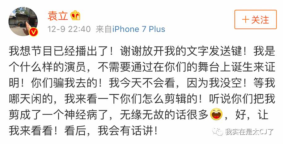 大概网友赞许打底了她的信心之后,她表示节目组终于放开了自己的文字发送键,可以发文字了!而自己是什么样的演员不需要被这个舞台证明,听说自己被剪辑成了神经病,自己还没空看,看完了就要来掰扯掰扯了。