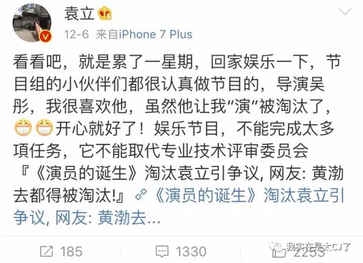 节目9号晚上开播,但6号的时候,袁立就分享了一篇讲她自己被淘汰了的文章,说“导演吴彤,我很喜欢他,虽然他让我‘演’被淘汰了”,并且还说“娱乐节目不能完成太多项任务,不能取代专业技术评审委员会”。