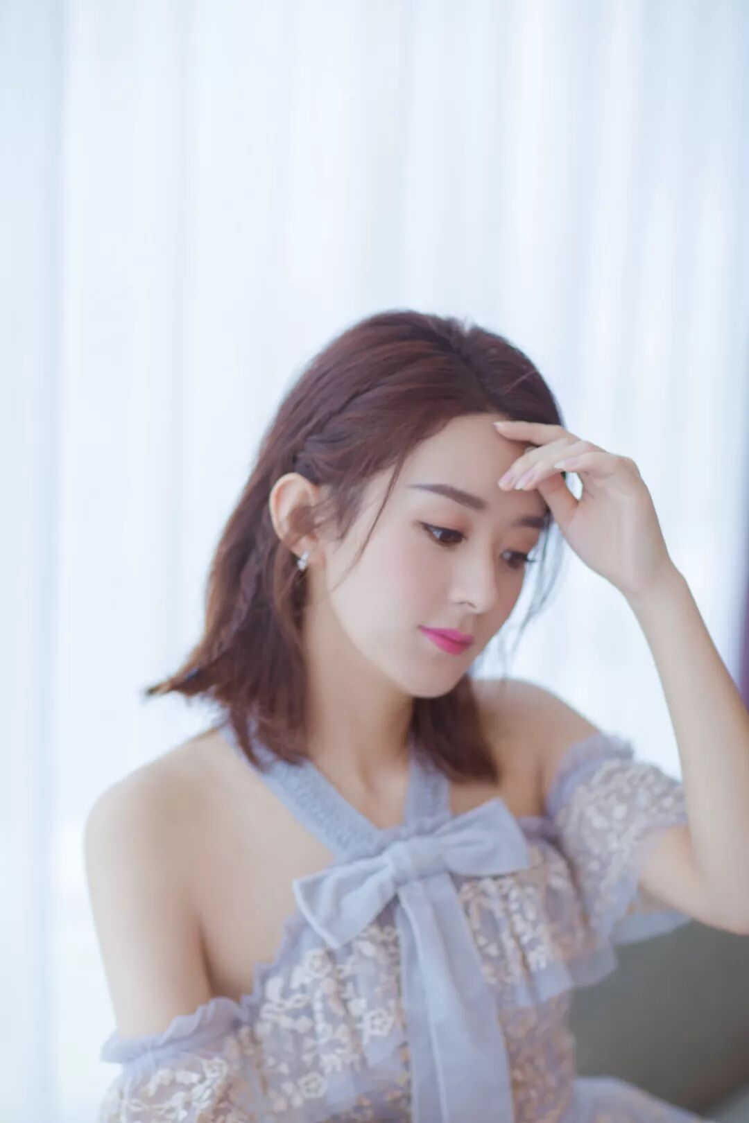▲锁骨发尾微微外翘时女人味爆表,美颜线刘海修饰微圆的脸型,加上露肩的蛋糕褶长裙,让颖宝美的如同湖水般温柔又莹润。找对了如今轻盈柔和的妆容,让赵丽颖的高级感也越来越强!