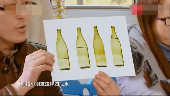 比如这道题:老师举起一张纸片,上面有四个水瓶,里面装了不一样的水,再往里面放一颗糖,问他哪个是最甜的。