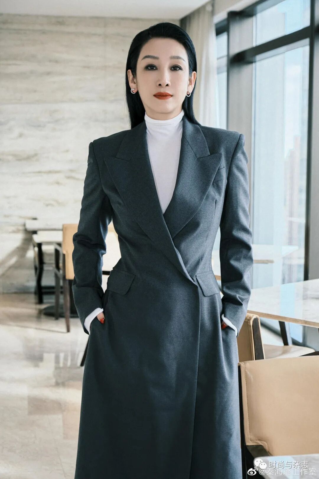 想要穿出知性大女人韵味很简单,你可以选择带有西装领设计的单品,就像秦海璐身上这件鼠灰色的西装领大衣,版型正统,通过经典的翻领形成了V领,所以对脸型与脖颈有修饰的作用,而内搭选择的是白色高领衫,所以同时也能兼顾保暖。