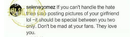然而接下来一幕让吃瓜路人们震惊了,前女友赛琳娜-戈麦斯竟然评论了这条ins,她郑重表示:如果你没办法忍受这些恶评那你就停止发布关于你女朋友的照片,这种事应该是你们两个人的,别跟你的粉丝们生气了,他们很爱你。