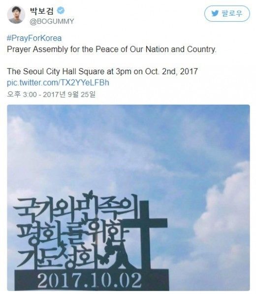 25日,朴宝剑在自己的SNS上传了耶稣中心教会主张的“为了国家和民族的和平祈祷圣会”的文字和照片,引发大片争议。