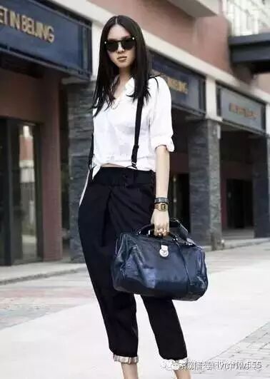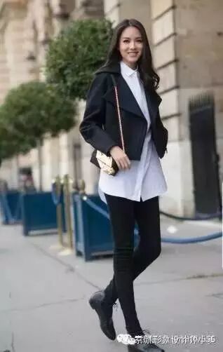 长款白衬衫外搭黑色小外套,增添层次感,黑色紧身裤更能修饰长腿,金色的包包更是点睛之处!