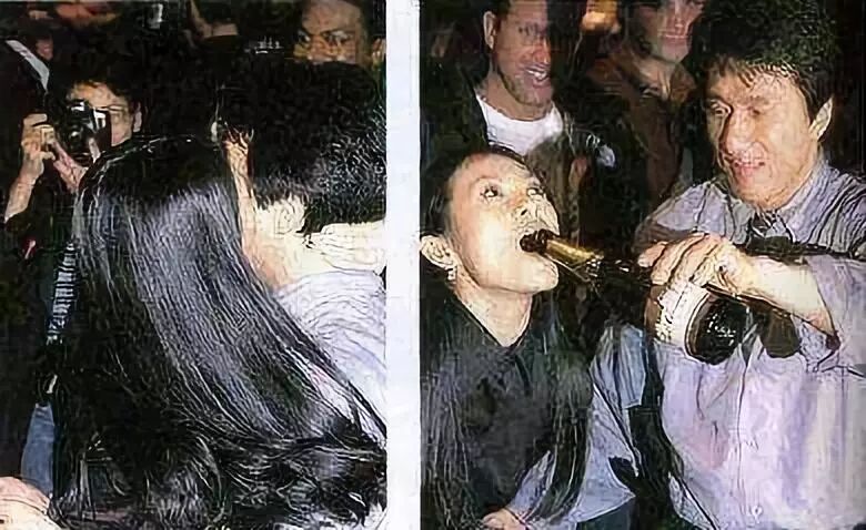 这是在《尖峰时刻2》的聚会上,成龙拿着一瓶香槟灌章子怡: