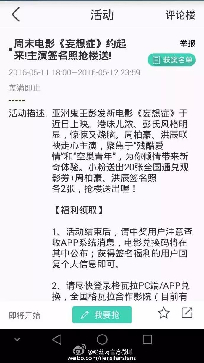 亚洲鬼王彭发新电影《妄想症》于近日上映。港味儿浓、彭氏风格明显,惊悚又烧脑。周柏豪、洪辰联袂走心主演,聚焦于“残酷爱情”和“空巢青年”,为你倾情带来新奇体验。小粉送出20张全国通兑观影券+周柏豪、洪辰签名照各2张,抢楼送出喔! 【福利领取】 1、活动结束后,请中奖用户注意查收APP系统消息,电影兑换码将在其中公布;获得签名福利的用户回复个人信息即可。 2、请尽快登录格瓦拉PC端/APP兑换,全国格瓦拉合作影院(目前有排片的影院)通兑,请于5月15日(含)前完成兑换。 3、360层、720层为周柏豪签名照;1080层、1320层为洪辰签名照;其余楼层为观影券2张 【特殊说明】 粉丝网旨在为真实星粉谋福利。活动送出的明星周边、票务福利严禁转卖。一经发现即取消所有获奖资格。