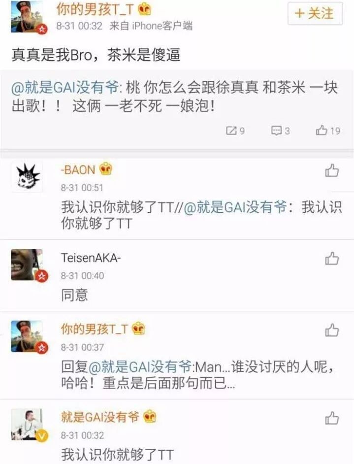 嫩桃和茶米、徐真真合作了首歌,GAI和嫩桃关系不错,发微博称:“桃,你怎么会跟徐真真和茶米一款出歌!!这俩一老不死以娘炮。”TT转发了这条微博,并说茶米是傻逼。
