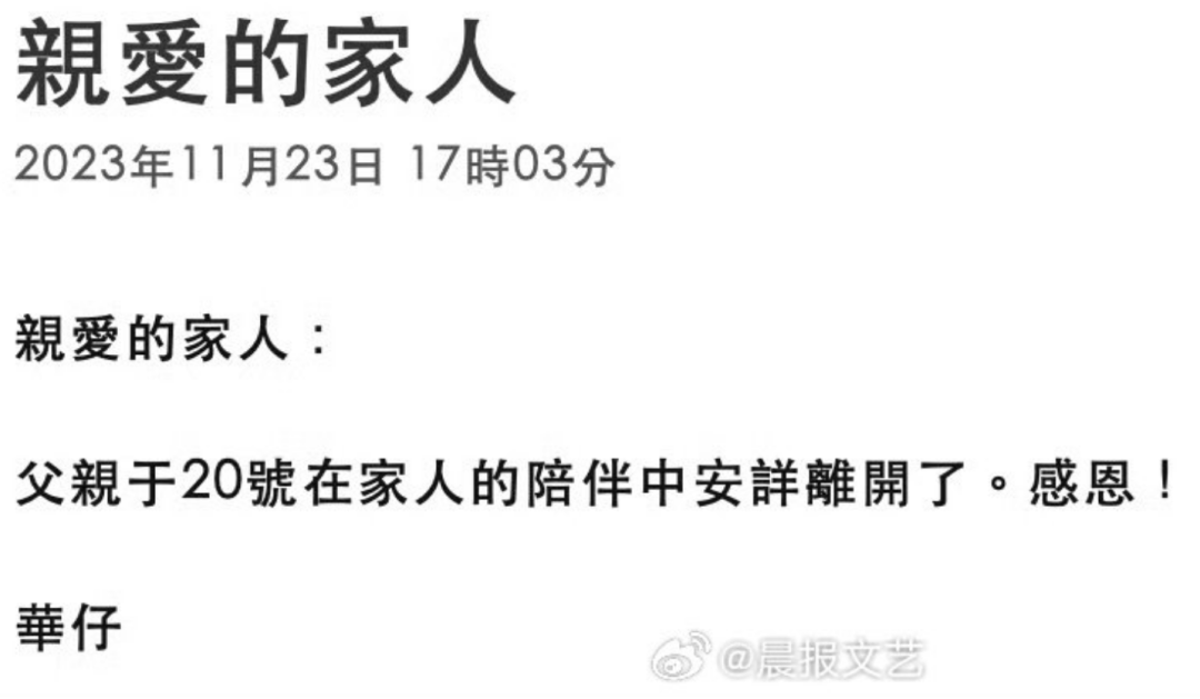 刘德华父亲逝世 微泰州 港台男星 2023-11-23 21:36:36 304 创作不易,用心坚持,欢迎请BaGua喝几杯爱心咖啡!打赏并支持本文 打赏并删除本文 ◆编辑:谢璨 石晶 陆思韵 ◆来源:晨报文艺、新浪娱乐◆本信息图文及视频版权归原作者所有,如有侵权请联系我们,以便发放稿费据华仔天地官网23日下午17点左右消息刘德华父亲刘礼于11月20日离世▼ 另据港媒刘德华方随后回应证实消息称现在处理身后事多谢大家关心目前华仔天地已将网页换成黑白色一路走好↓↓↓ 创作不易,用心坚持,欢迎请BaGua喝几杯爱心咖啡!打赏并支持本文 打赏并删除本文 感谢您的支持鼓励,我会继续努力的!文章地址:用户邮箱:打赏金额:USDT 请输入数字点击”去打赏“,即可进行打赏支持本文章哦 刘德华 发表评论