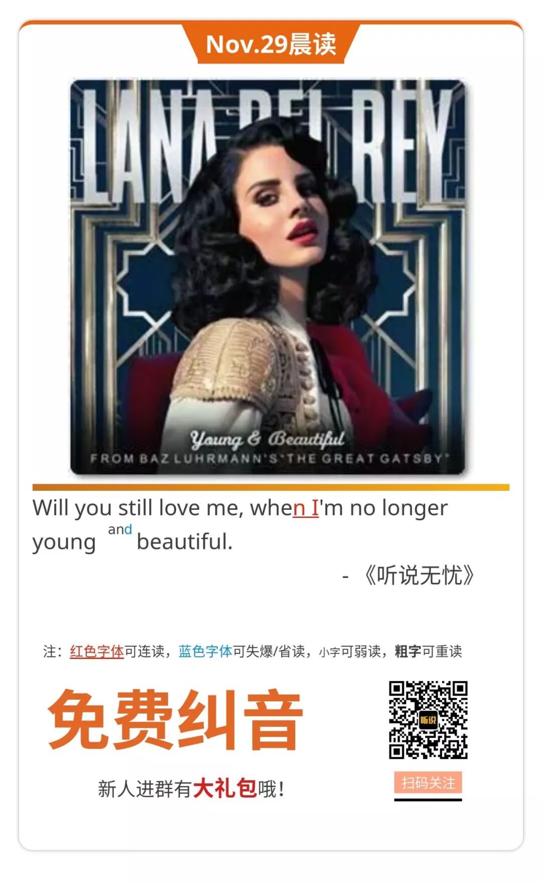 注:红色字体可连读,蓝色字体可失爆/省读,小字可弱读,粗字可重读