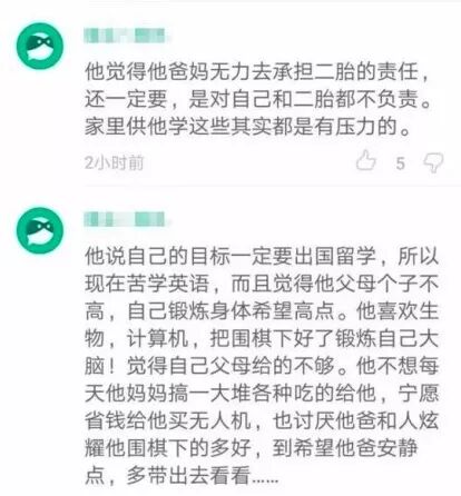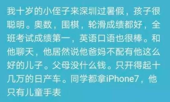 然而这位被父母视为心尖儿上的宝贝,在外人面前却是对父母毫无遮挡的嫌弃:他们没什么钱,只开得起十几万的丰田,同学都拿着iPhone7,自己只有儿童手表。