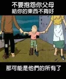 记得看过一个漫画,孩子被父母牵着手,叫上两只不一样的破鞋子,父母一人光着一只脚,没人给孩子一只脚,上面写着:不要抱怨父母给你的东西不够好,那可能是他们能给你最好的东西。