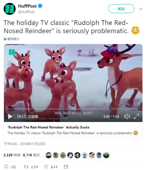 还有一个细节是,赫芬顿邮报的这段视频中,关注的是电影的前半部分,鲁道夫所遭受的语言攻击和孤立;但值得注意的是,这部影片的结局是好的,片中的霸凌行为最终也得到了“和解”,《红鼻子驯鹿鲁道夫》中的一个配音演员科瑞涅·康利(Corinne Conley)就是这么认为的,并说: