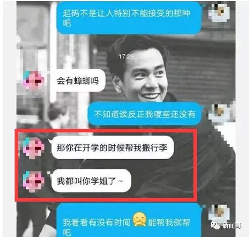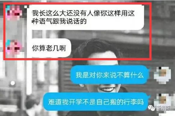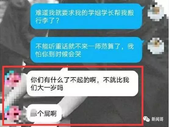 近日,湖南第一师范学院一新生四处寻找学长学姐开学帮背行李,都没得到肯定答复,勃然大怒、口出狂言:“你有什么了不起,不就比我大一岁吗?”聊天记录让哥看了想打人: