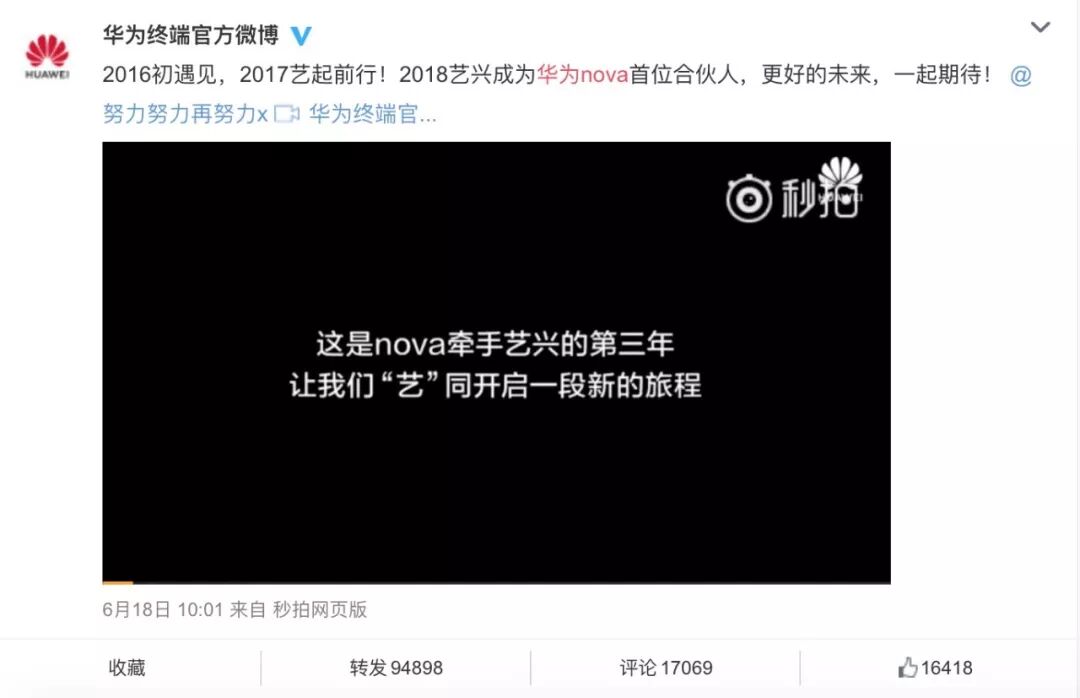 6月18日,华为官微发布张艺兴牵手三年混剪视频,现在回望,张艺兴和华为nova一起走过了三年时间。