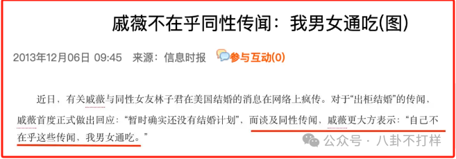 关键是,在“戚薇计划和林子君完婚”的消息被传得轰轰烈烈时,林子君直接炸毛大骂“没有道德底线”,戚薇倒是十分配合,在莫小棋的节目上,更是宣扬自己“男女通吃”,曾被女性表白打动。