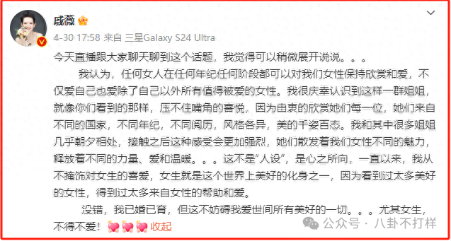 对此,她表示不是人设,是心之所向,“任何女人在任何年纪、任何阶段都可以对我们女性保持欣赏和爱”,“我已婚已育,但这不妨碍我爱世间所有美好的一切,尤其女生,不得不爱”。