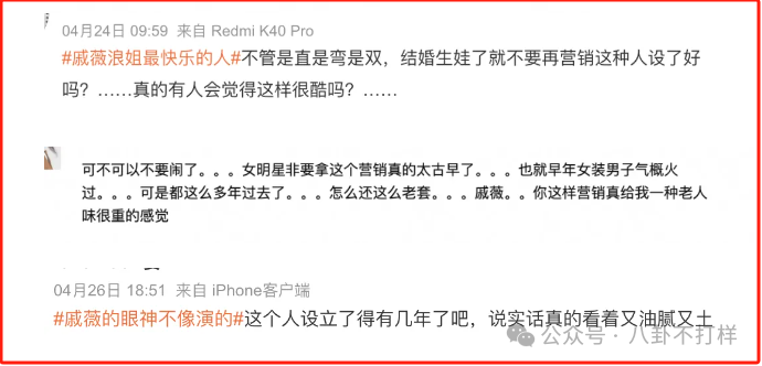 但面对这工业糖精,也有部分清醒的网友,表示自己吃不下。戚薇明明已婚,还是两个娃的妈,为何还要吃卖姬的福利?