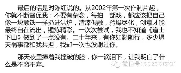 芭姐想起来前两天,陈凯歌导演发了条名为“对你说”的长微博,回顾3年来拍《道士下山》的经历,最后还在文末对陈红深情告白!