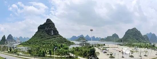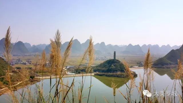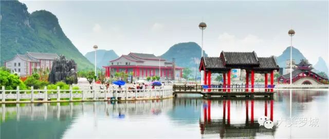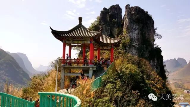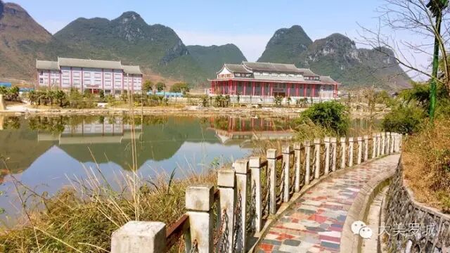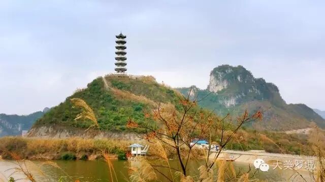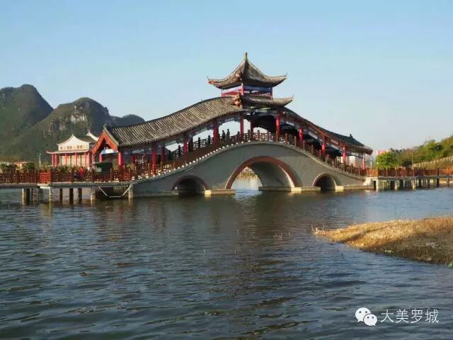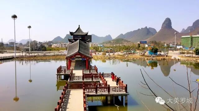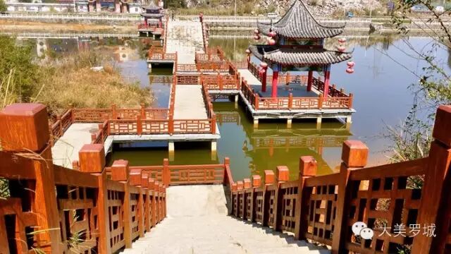 九曲桥单檐四角亭古香古色,别致雕梁画栋独具仫佬族特色。