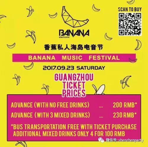 As an official media sponsor for Banana Festival, Asia Club Zone will hook you up with an amazing ticket deal not available to the general public. Only 150 RMB includes entry fee and round-trip transportation from Shenzhen on our private buses (200 RMB from Guangzhou)... or pay 180 RMB and also get 3 free mixed drink coupons upon arrival! (230 RMB from Guangzhou).