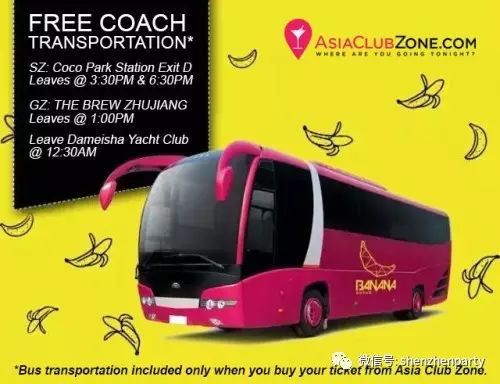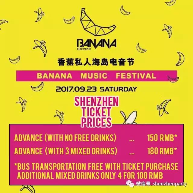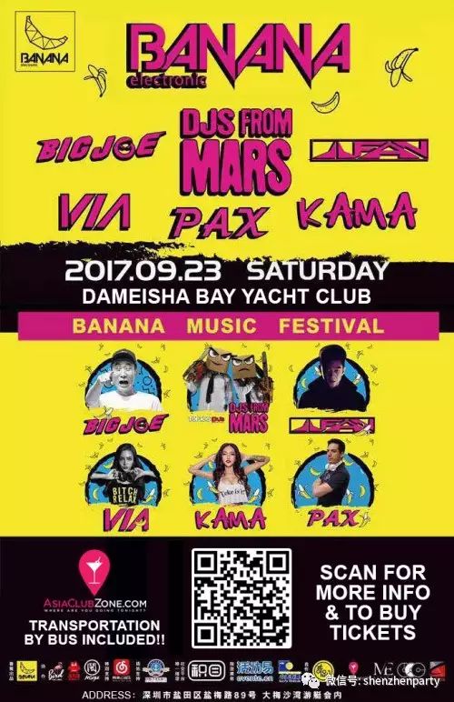 The Banana Electronic Music Festival is held at the private Dameisha Bay Yacht Club. Take our FREE bus (included in your ticket price). Show us your ticket purchase receipt when getting on the bus to receive your entry ticket and free drink coupons. Don't be late as it is not our responsibility to wait for you: