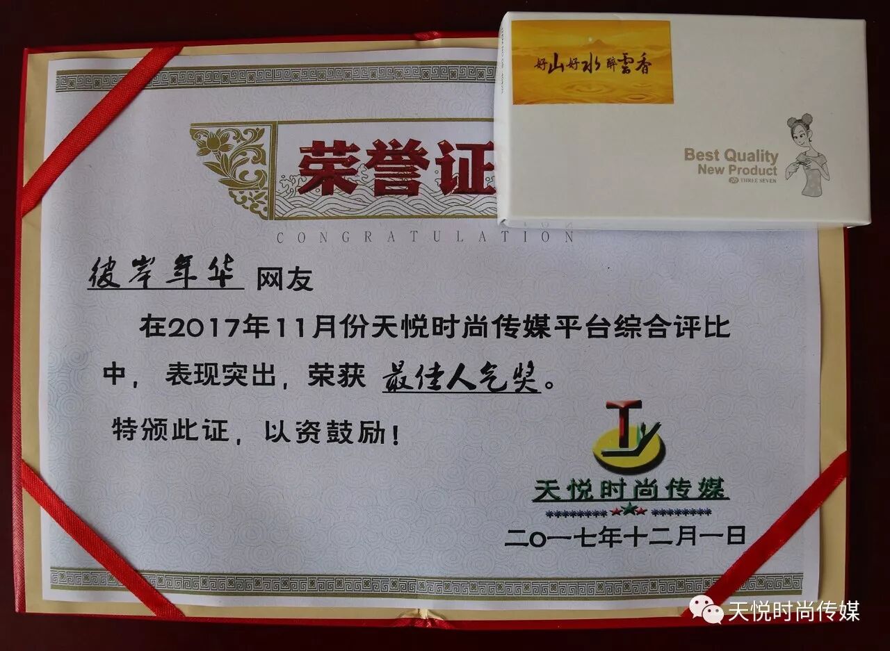 通过综合评比,网友彼岸年华获得天悦时尚传媒平台2017年11月份“最佳人气网友”称号。她将获得由天悦时尚传媒平台颁发的荣誉证书及云南中烟集团提供的价值100元的韩国77牌指甲刀一套。