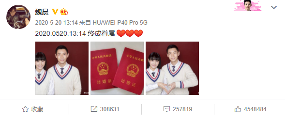 而下一次秀恩爱就直接快进到20年5月20日13点14分晒结婚证。