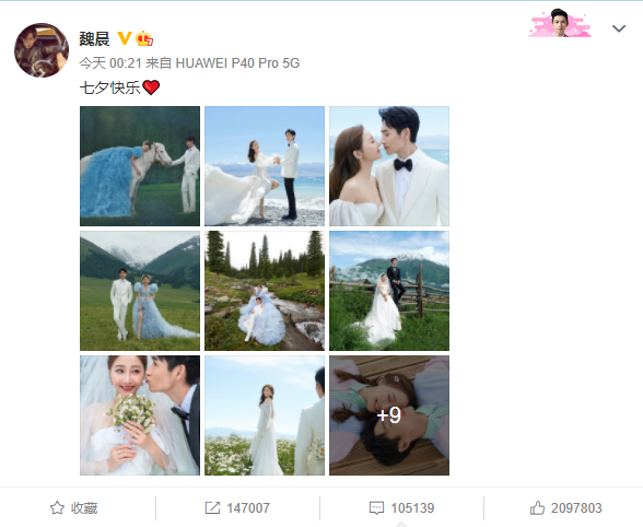 七夕的第一口狗粮来自魏晨,一个月都发不了一条营业微博的魏晨,直接卡点21(爱你)放出18张婚纱照暴击。