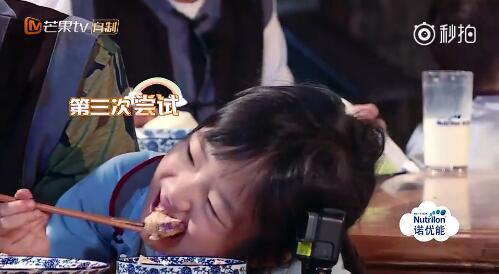 选择了丰盛肉宴的吴尊一家坐在桌前大快朵颐,镜头对准neinei,她用筷子夹起一块肉,送进嘴里,吃力地咬起来。