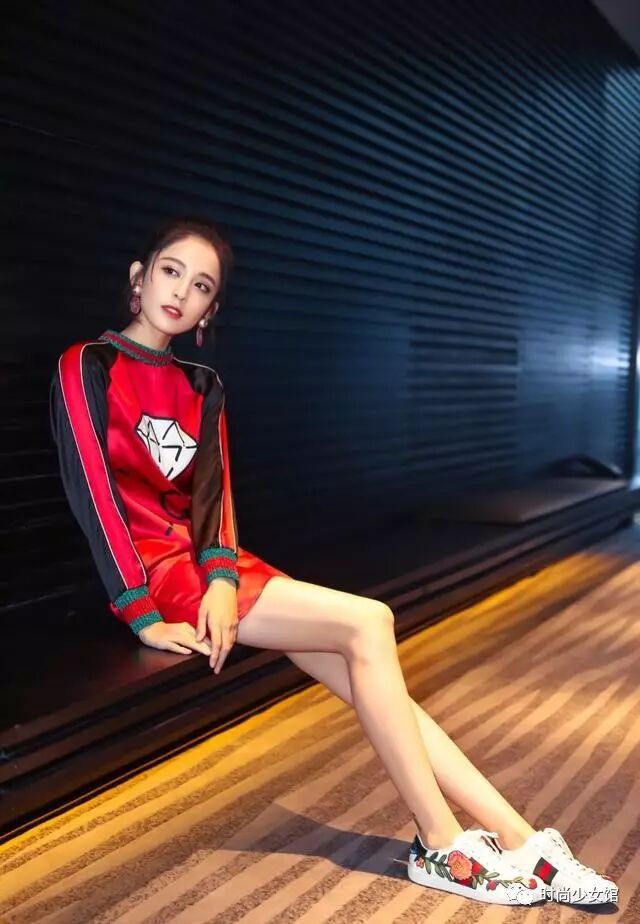 红色套装搭配Gucci小白鞋,还是熟悉的大长腿。