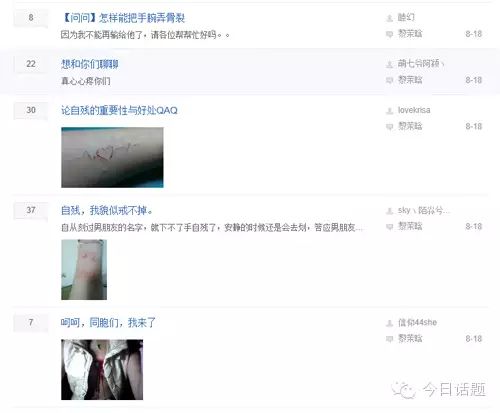 心理承受力好的人,可以点进百度“自残主流”贴吧看看,里面有大量青少年自残图片,并且有人呼吁“残宝宝们,来聊聊。发几张自残照!”在其中的一些帖子下,也可以发现因追星而自残的案例。