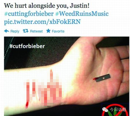 2013年,加拿大18岁歌手贾斯汀·比伯(Justin Bieber)被拍到吸大麻的照片,虽然迄今为止,他没有对这个严重伤害形象的爆料做出任何回应,但却传出,已有粉丝上网呼吁“为了小贾斯汀割腕”(Cut for Bieber),并且形成声势浩大的活动。他们上传一张张血淋淋的照片,以此“血谏”他不要吸毒:“只要你别再碰毒品,我们就不再用刀割自己,你让这个世界变得没有意义,我们已经失去希望。”