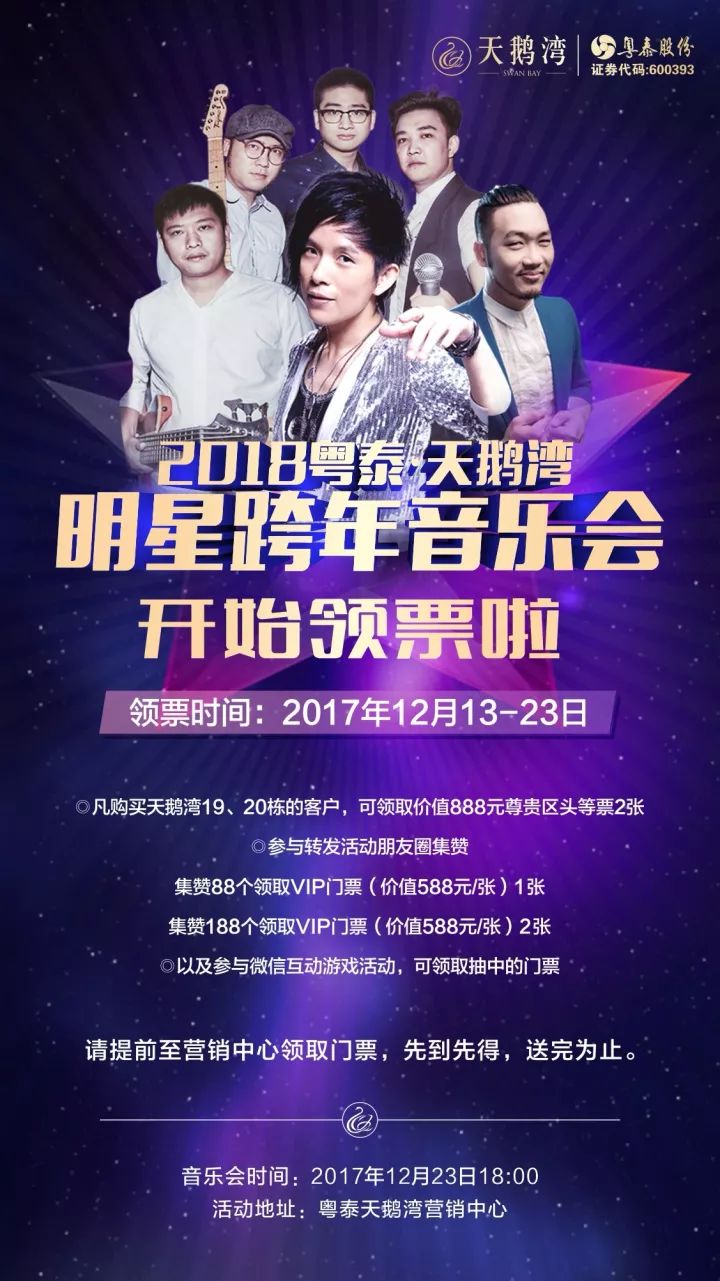 参与微信朋友圈游戏获赠天鹅湾明星跨年音乐会门票。