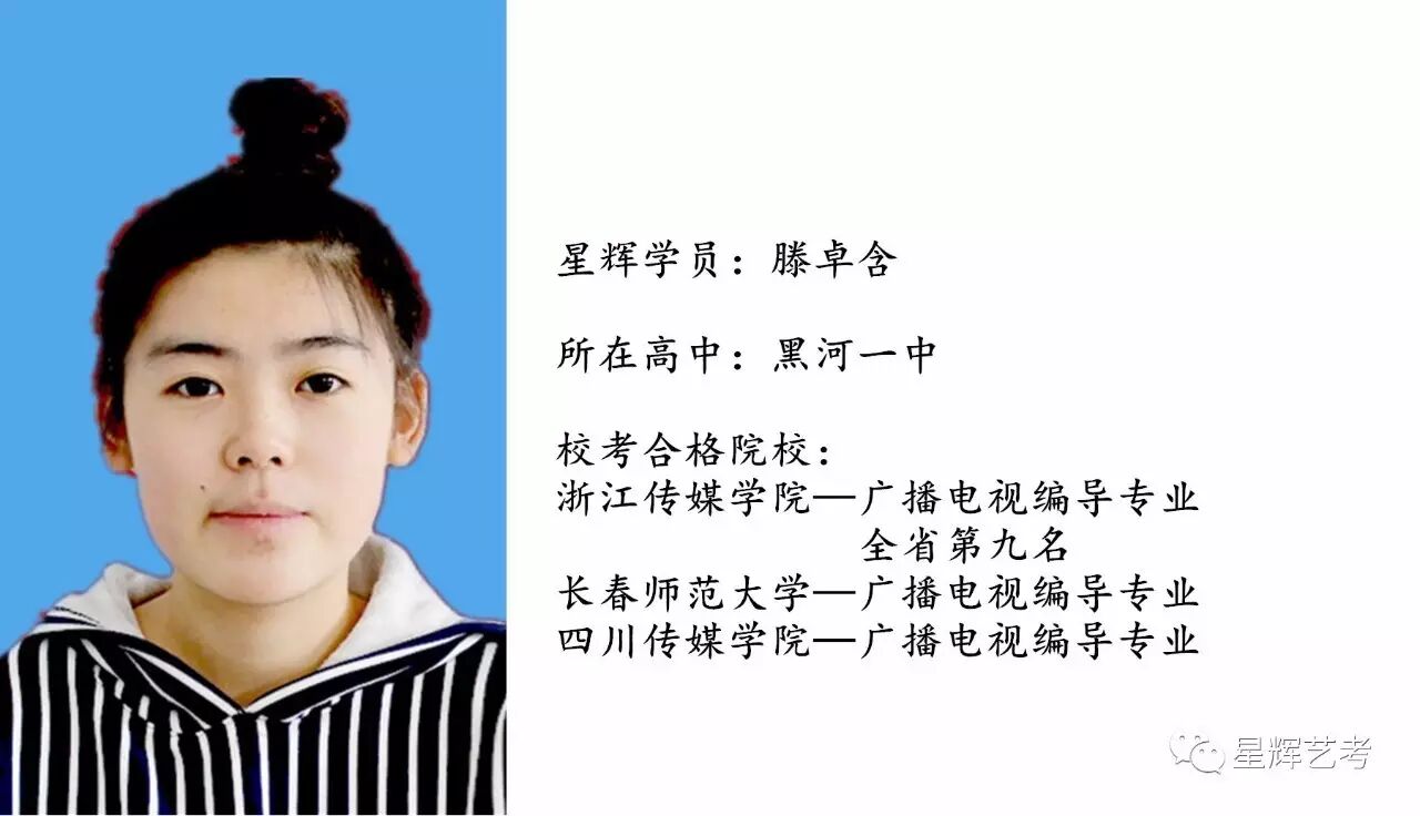 朱俊宇,绥滨一中(广播电视编导全省第一);关子晴(尚志二中)、邹妍茜(齐齐哈尔一重五中)、李昂(绥化七中)、裴振先(绥化一中)、郭海奇(望奎一中)、张梓溪(哈尔滨59中)、徐志乾(双鸭山一中)刘荣荣,嘉荫一中(编导全省第一);张欣,阿城二中;王筝,宾县三中;崔梦迪,大庆四中;张昊田,哈尔滨松雷中学;生安泽,海林林业一中;刘荣荣,嘉荫一中;衣美祺,建三江一中;刘丽鹏,塔河二中; 徐志乾(双鸭山一中)