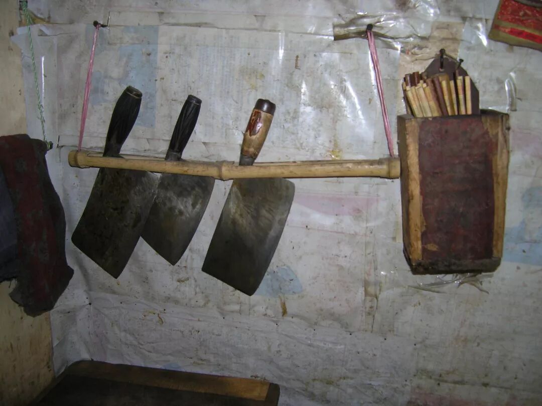 韩婆的房屋就在小巷的中部,转身回首,去韩婆房屋的那段石坎路虽然经历了几个小巷和弯道,但石坎一直不间断。这栋三间门面的房屋是土木结构,门前全部是实木板壁,房子虽然很陈旧,但也是有里有外,堂屋与睡房用竹篱笆间隔着,再往里去,右边就是厨房,这厨房虽然不足10平方米,但厨房被韩婆布置的干净利落、井井有条,一个灶台紧贴在厨房靠右的墙皮上,灶台相邻40余公分处就是一个大案板,案板分了两层,上面摆满了许多灶具。