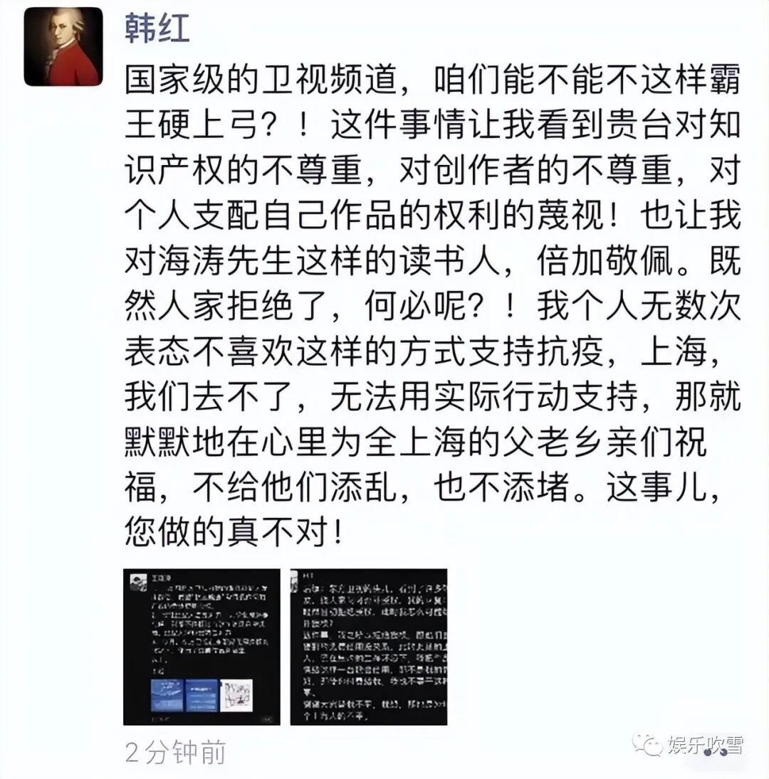 难怪不少网友纷纷表示无法理解,毕竟这一场“抗疫晚会”引发众怒,网上还有疑似韩红的个人朋友圈发布新动态,怒怼某台对知识产权和创作者的不尊重,还透露了这次疫情没能到一线帮忙,表示无法用实际行动支持上海市民。
