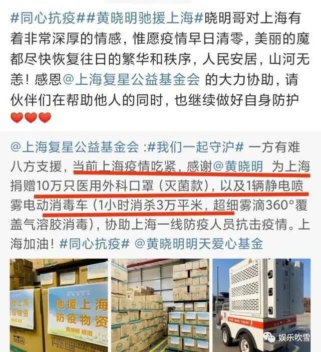 对比黄晓明倒是第一时间帮忙为上海捐款捐物资,据悉黄晓明低调向上海捐赠了10万个一次性医用口罩,以及一辆电动消毒车。