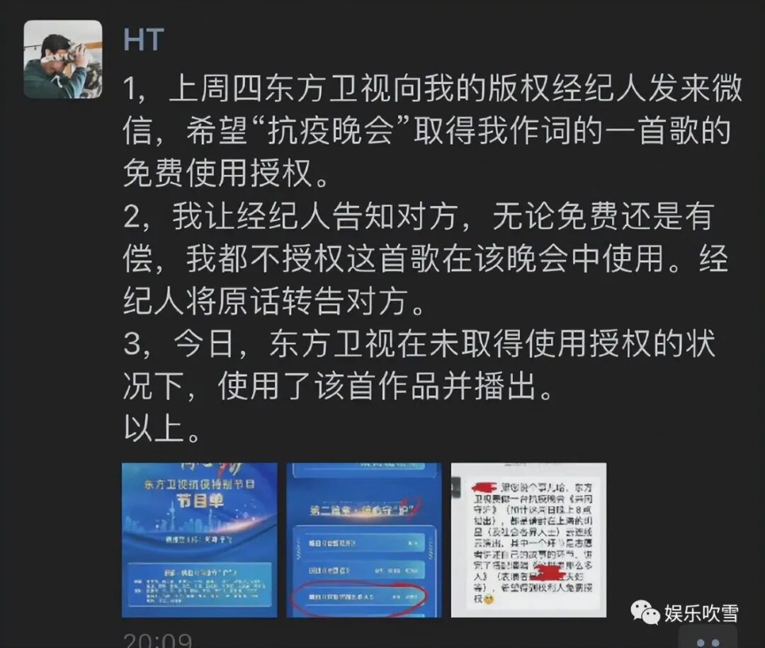对比节目单中《这世界那么多人》曲目的词作者王海涛拒绝授权歌曲在某晚会使用,还直言目前的状况不会把作品提供给这样一台晚会使用,被网友大赞其有良知。
